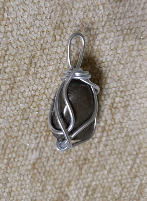 В Интернете нашлось множество видео, как оплести проволокой камень, и я выписала на том же "Алиэкспрессе" алюминиевую проволоку для ювелирных поделок. К сожалению, я немного промахнулась с диаметром проволоки, и она оказалась толще, чем я рассчитывала, так что с дизайном пришлось импровизировать на ходу. Впрочем, результат мне скорее понравился: видно мастерскую Самоделкина, но в то же время похоже на настоящее украшение в таком брутальном стиле. Проволоки осталось много, можно будет ещё что-нибудь оплести .
